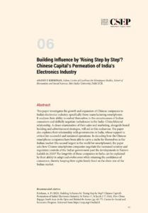Abstract: This paper investigates the growth and expansion of Chinese companies in India’s electronics industry, specifically those manufacturing smartphones. It analyses their ability to embed themselves in the consciousness of Indian consumers and skillfully negotiate turbulences in the India–China bilateral relationship. A closer examination of their sales and marketing, alongside brand building and advertisement strategies, will aid in this endeavour. The paper also explores their relationship with governments in India, whose support is critical for successful and sustained operations. In decoding how the Chinese smartphone companies have been able to carve a niche for themselves in the Indian market (the second largest in the world for smartphones), the paper asks how Chinese smartphone companies negotiate the increased scrutiny and regulatory controls of the Indian government post the developments in Eastern Ladakh in 2020? The longevity of these companies in India can be explained by their ability to adapt and evolve even while retaining the confidence of consumers, thereby keeping their sights firmly fixed on the sheer size of the Indian market.